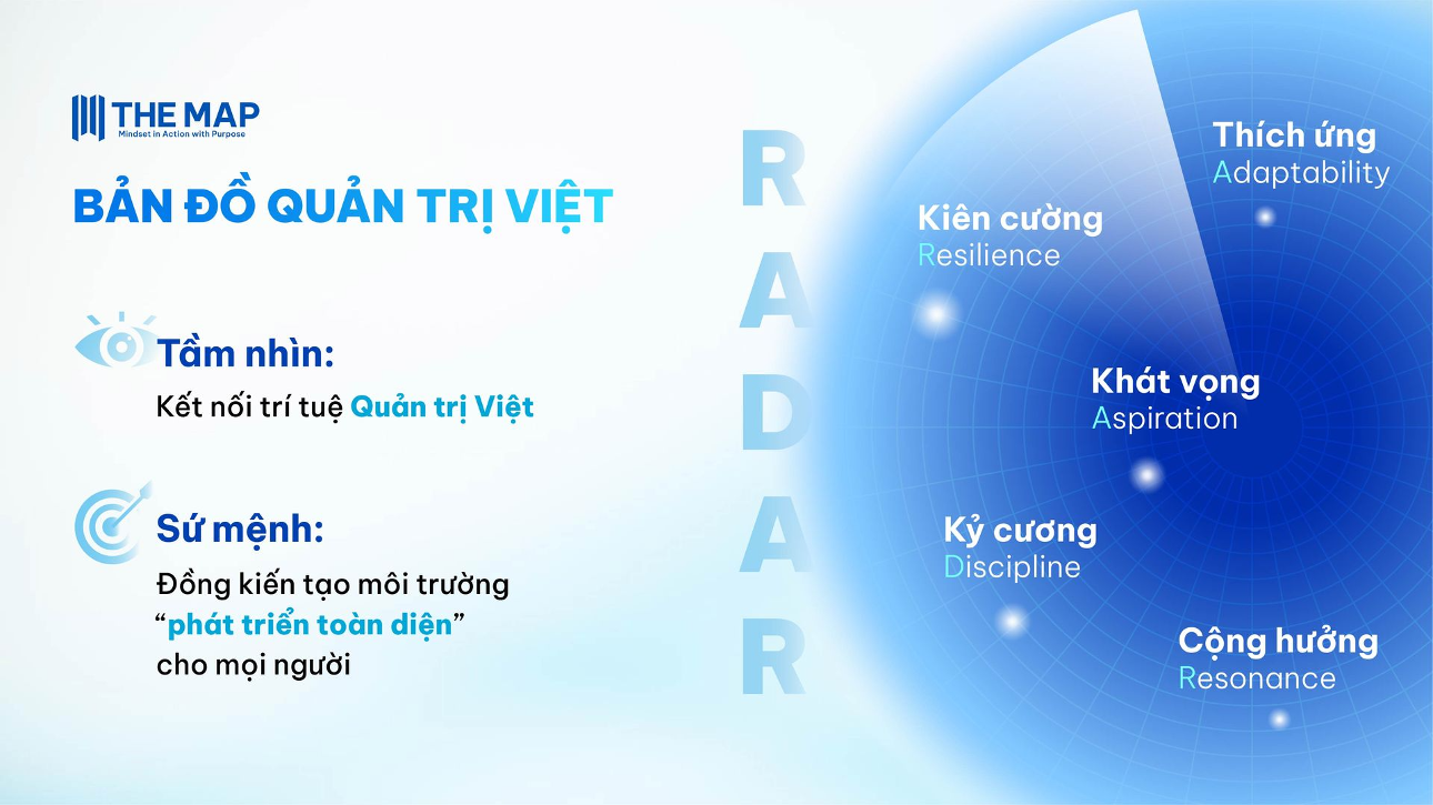 Năm 2025, Công ty Cổ phần Bản đồ Quản trị Việt (The MAP) được sáng lập với tầm nhìn trở thành nền tảng hội tụ những nhà quản trị hàng đầu, kiến tạo mô hình và hệ thống quản trị lấy Chất Việt làm nền tảng, hiện thực hoá sứ mệnh giúp doanh nghiệp Việt chuyển hoá bản sắc dân tộc thành bản lĩnh cạnh tranh. Chúng tôi đồng hành để nâng cao giá trị doanh nghiệp, xây dựng đội ngũ lãnh đạo kế thừa và nuôi dưỡng bộ ADN Chất Việt: Khát vọng – Kỷ cương – Kiên cường – Thích ứng – Tích cực nhằm tạo nền tảng vững bền cho hành trình vươn tầm quốc tế.